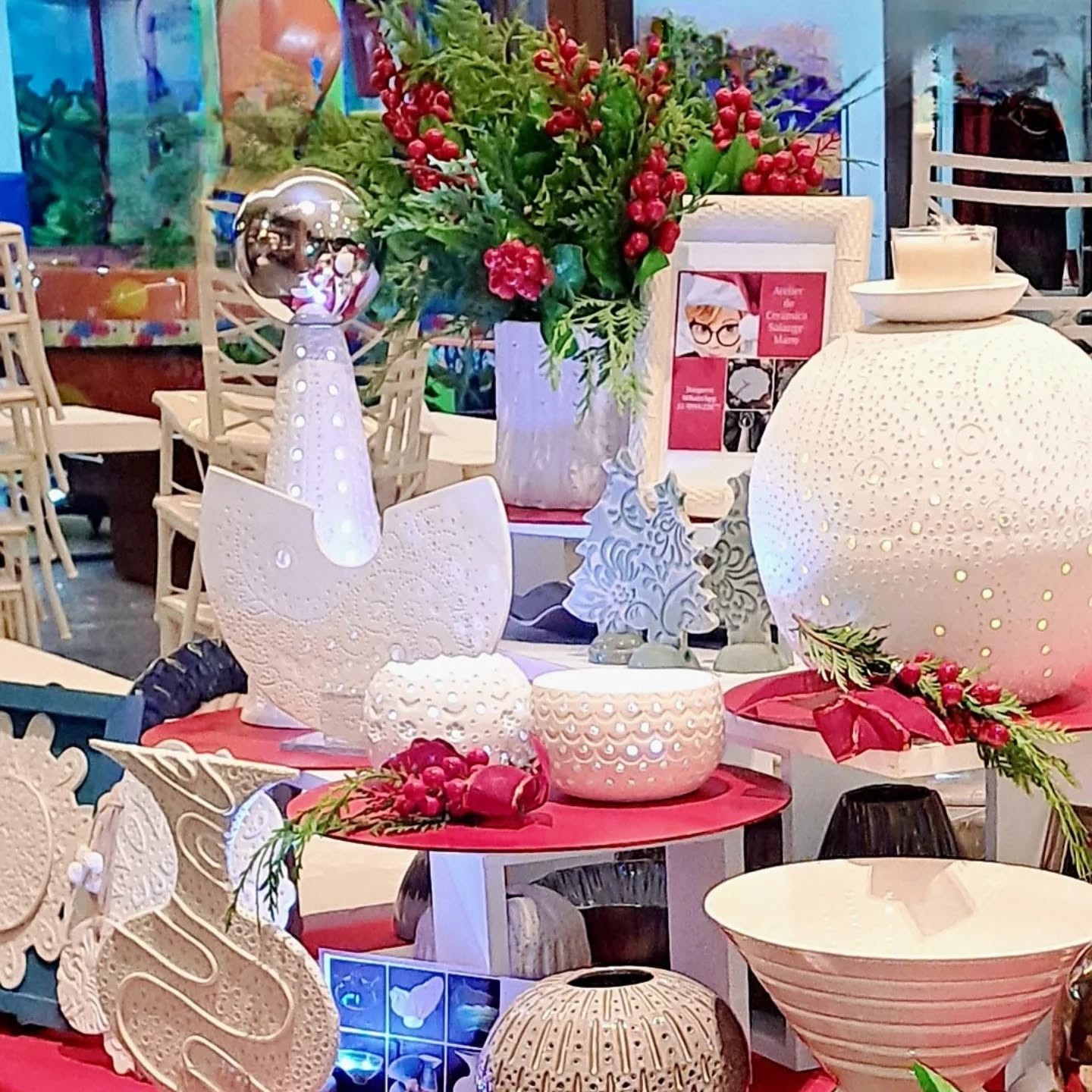 Montada no Shopping Estação Locanda, que se transformou em uma verdadeira caixa de presentes repleta de surpresas, com linda decoração, levando-nos de volta aos Natais de nossa infância, reúne uma variada gama de peças temáticas, totalmente voltada para o Natal. Com sugestões não só para presentear, mas, também, para dar um ar exclusivo e único às nossas casas, apresenta itens assinados por nomes do naipe de Solange Bonfim Mano, Rosane Teixeira, só para citar alguns dentre os quais árvores de Natal únicas, feitas em cerâmica, luminárias, vasos para arranjos florais e abajures dentre muitas outras opções totalmente exclusivas. O evento acontece até esse sábado, com exposição, venda e oficinas.